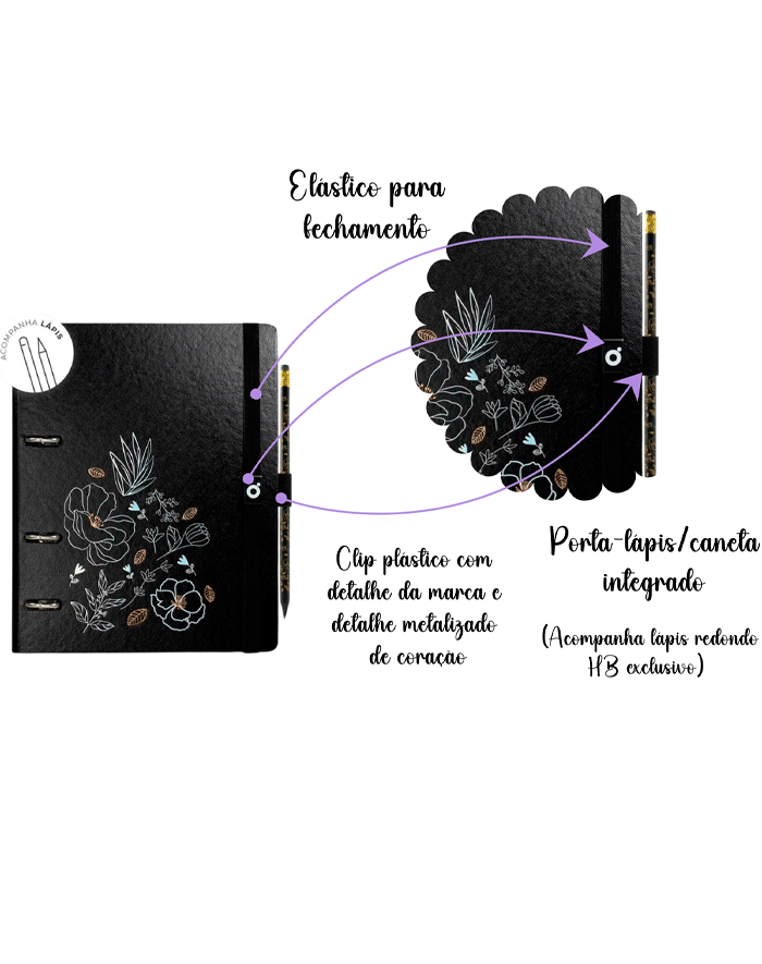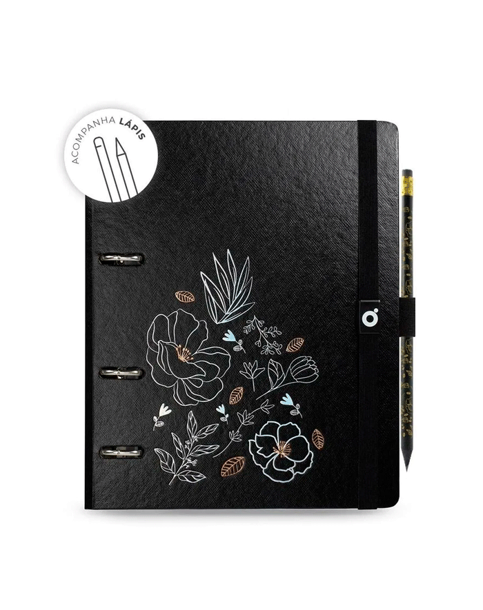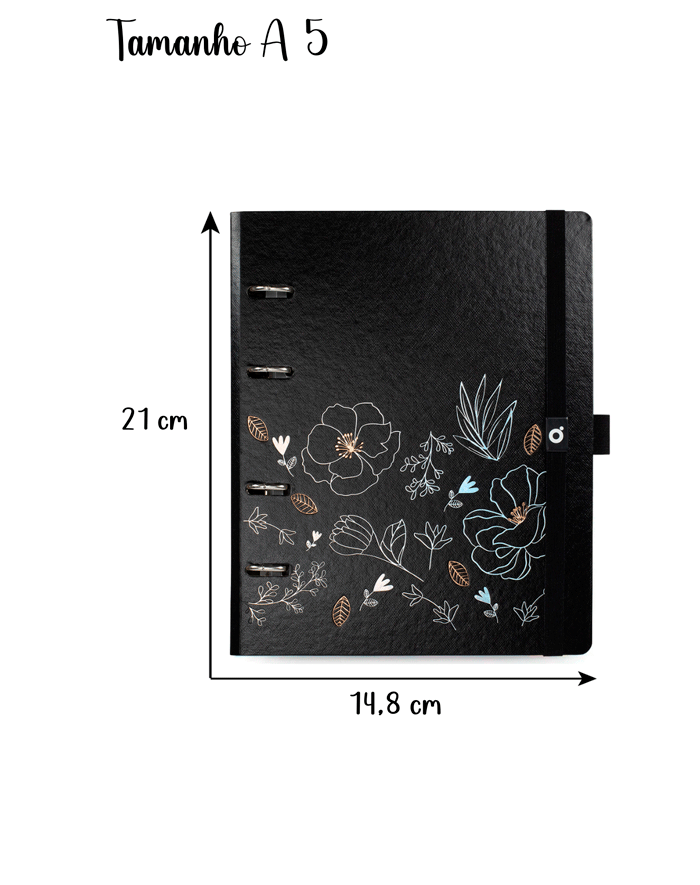 A Coleção Noir une a sofisticação do preto à delicadeza das flores, resultando em um design elegante e marcante. Nesta versão em formato A5, o caderno é ideal para quem busca organização compacta sem abrir mão do estilo.