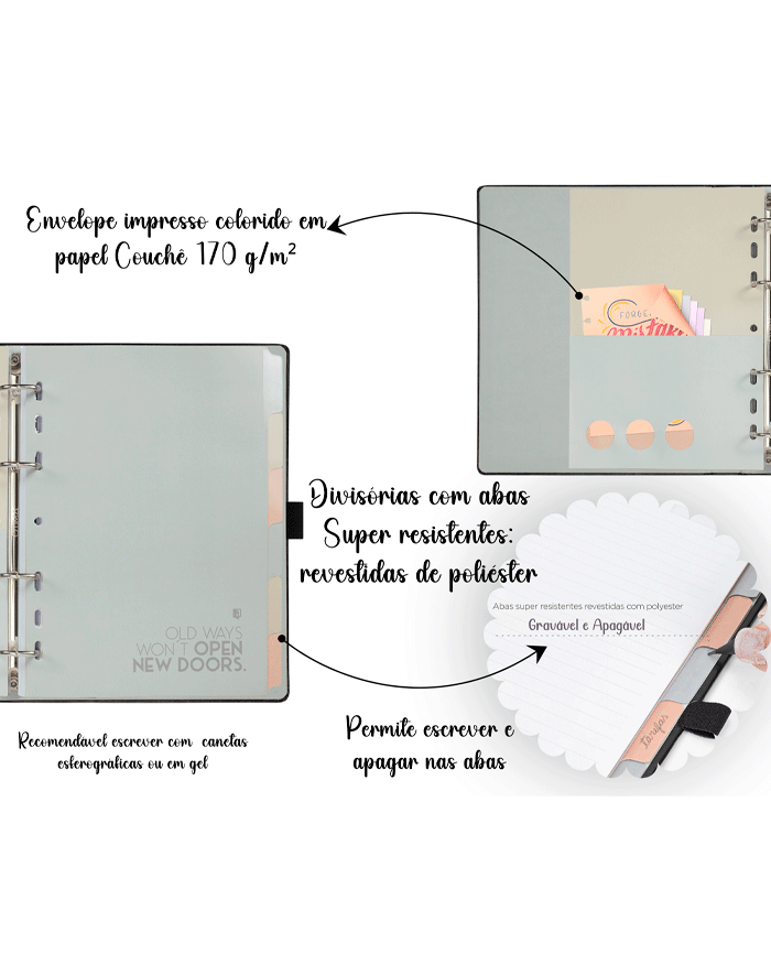 6 separadores com abas, revestidas com poliéster, produzidos em papel Couchê 170 g/m², o que permite escrever e apagar nas abas