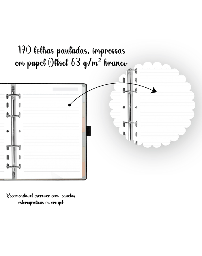190 folhas pautadas, impressas em papel Offset branco 63 g/m² com linhas pretas