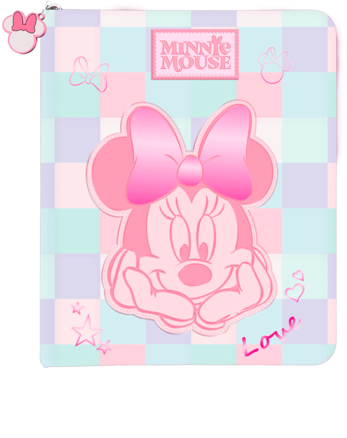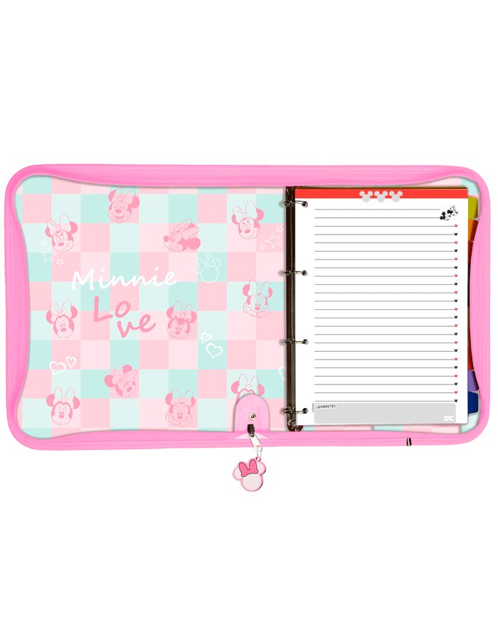 Com ferragem fixa de 4 argolas, 10 divisórias e 48 folhas de gramatura 90g, ele é perfeito para manter tudo bem organizado. O design une simplicidade, requinte e a fofura inconfundível da Minnie.