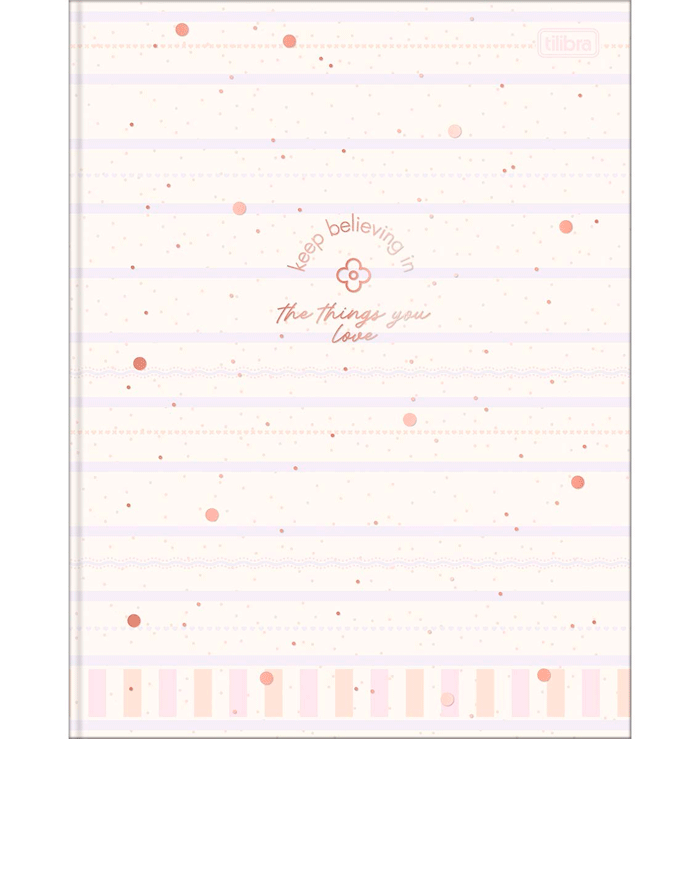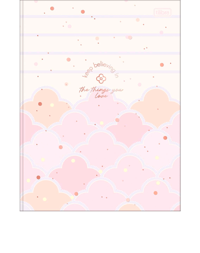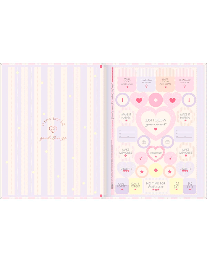 Com capa dura e detalhes metalizados, o modelo combina resistência e estilo. A parte interna é decorada, e o miolo traz folhas pautadas, perfeitas para anotações e resumos. Além disso, o caderno acompanha cartela de adesivos, tornando a rotina ainda mais prática e divertida.