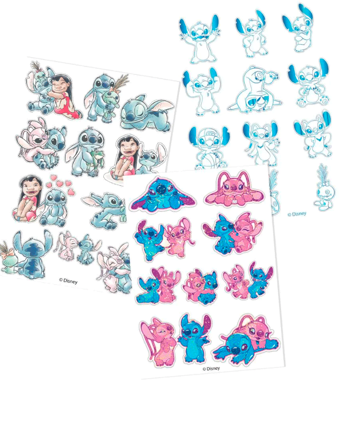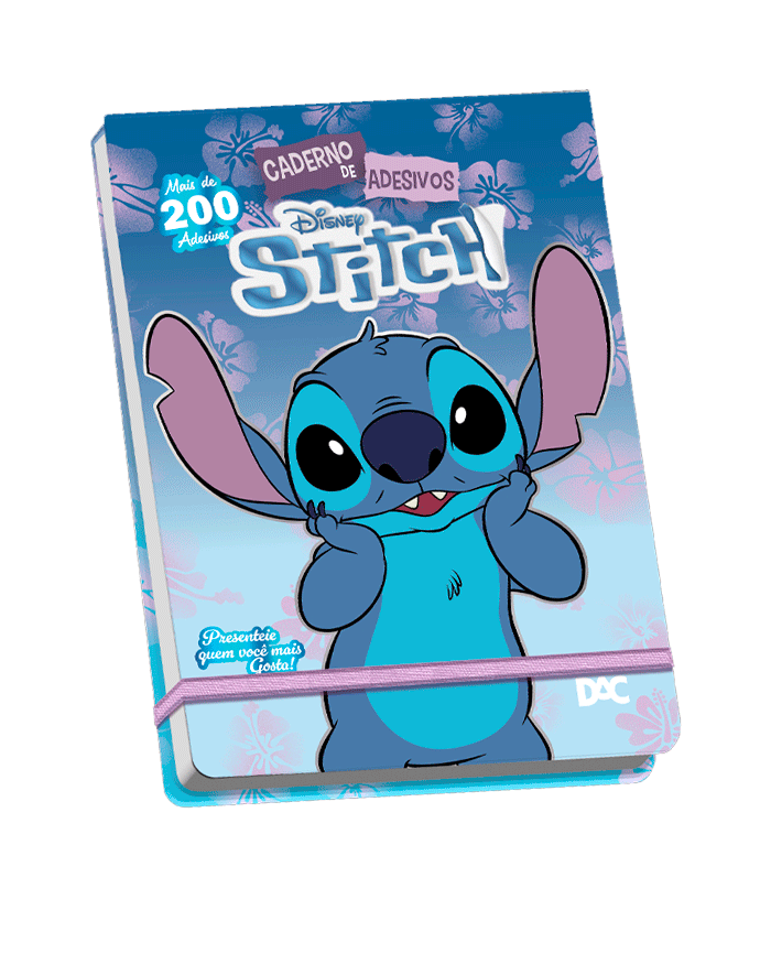 O caderno contém 200 adesivos destacáveis distribuídos em 20 folhas ilustradas com personagens clássicos do Stitch, trazendo toda a magia e fofura do monstrinho mais querido da Disney.