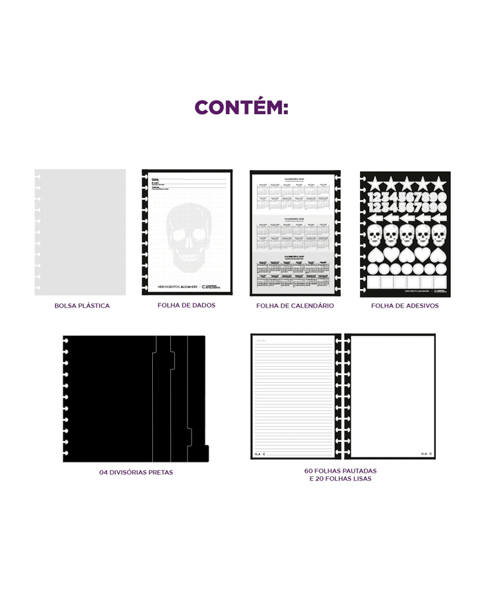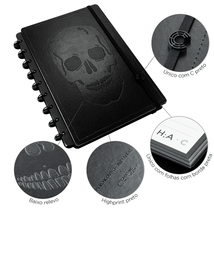 Por ser totalmente customizável permite desde a troca de suas folhas reposicionáveis de alta gramatura e qualidade, de seus discos em tamanhos diferenciados para aumentar ou diminuir a quantidade de folhas e de suas capas e contracapas com estampas exclusivas.