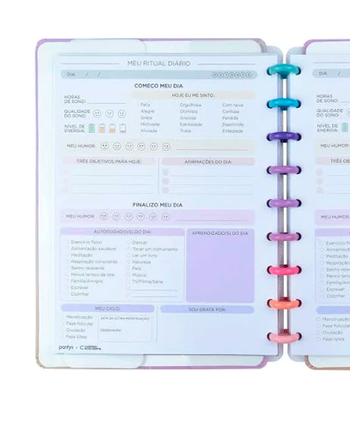 A versão Diário do Bem-Estar by Pantys foi desenvolvida para quem busca equilíbrio entre corpo, mente e alma. Com design moderno e capa em degradê suave, ele inspira o autocuidado, a positividade e a leveza no dia a dia. Ideal para organizar a rotina com foco na saúde mental e emocional, transformando pequenas ações em grandes mudanças.