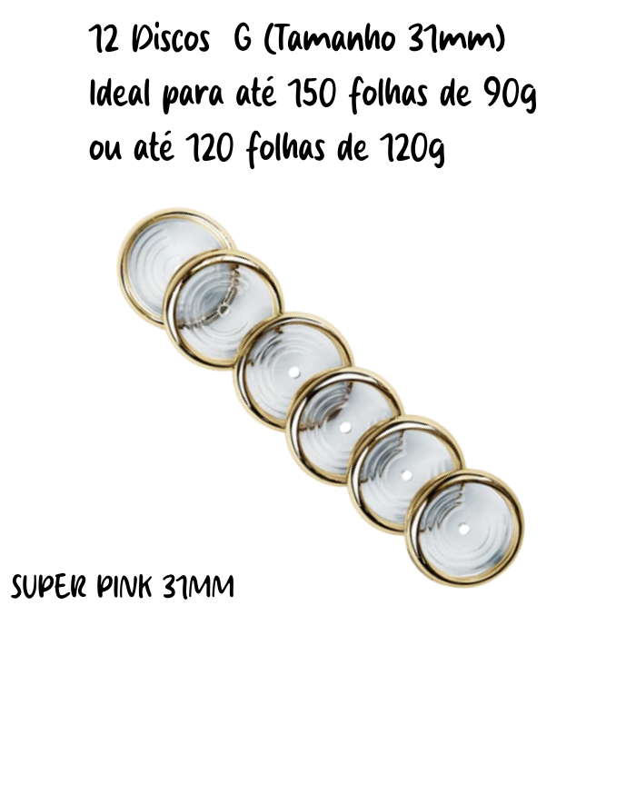 Os cadernos completos já acompanham discos tamanho M como padrão, exceto o modelo G+/10 matérias, que acompanha discos tamanho G.