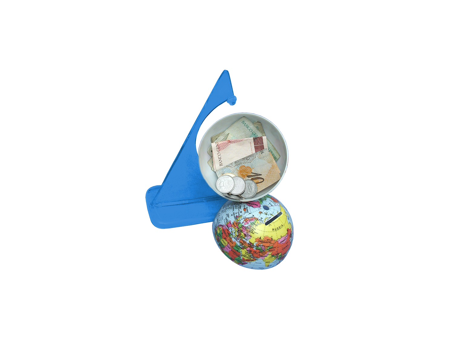 Possui uma fenda no hemisfério norte, o globinho é também um cofrinho! E quando estiver cheio, é só abri-lo e remontá-lo.