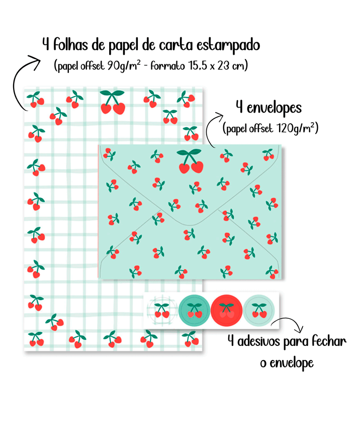 Relembre o prazer de escrever à mão com o Papel de Carta Cereja, um mimo encantador que traz de volta o charme das cartas e das trocas cheias de significado. Perfeito para guardar, presentear ou colecionar com amor.